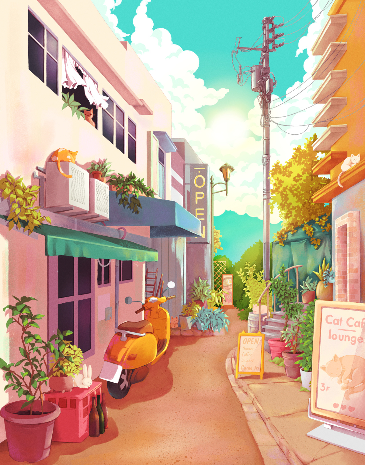 Please provide reference image of a character, list of 3 items that will be used in illustration and your color preferece for background